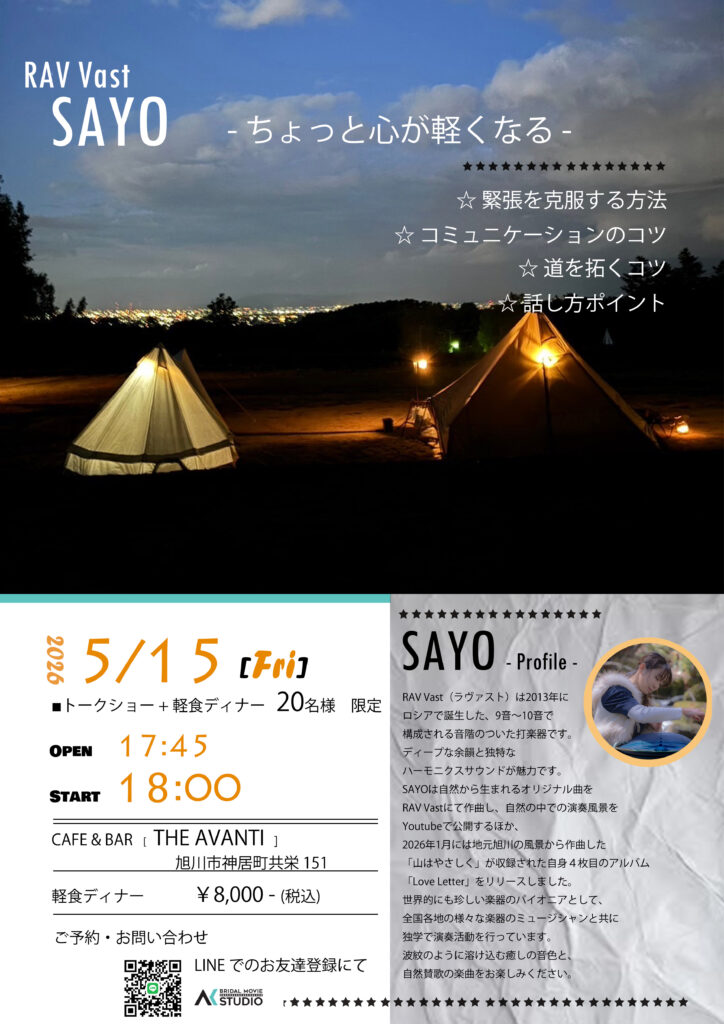 2026.5.15(金)旭川市内のCAFE&BAR「THE AVANTI」さんにて、トークと、軽食ディナーと、演奏を、わたくしSAYOと共に、お過ごしいただきたい、ちょっと変わったパーティ